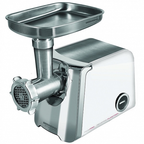 Многофункцональная мясорубка от Redmond предоставляет возможность перерабатывать мясо в фарш, шинковать продукты и выжимать сок. Данная модель имеет большой набор насадок и даже толкатель. Стоит отметить, что производитель является отечественным, а сборка техники производится в Китае.