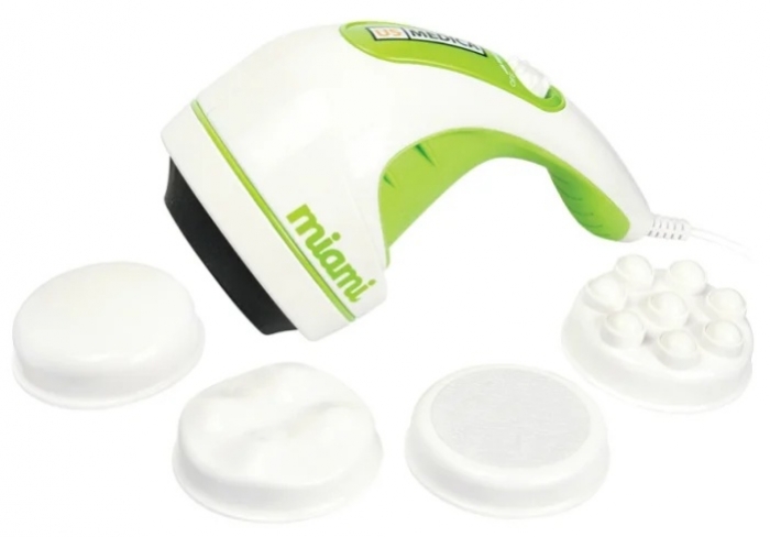 Этот прибор представляет собой антицеллюлитный массажер – недорогой, но функциональный. В комплектацию входят насадка с роликами, расщепляющими подкожные жировые отложения, волновая насадка для расслабляющего массажа, насадка с шероховатой поверхностью для работы с загрубевшей кожей (ее используют на самой низкой скорости вращения). Также здесь есть тканевая насадка, которая смягчает действие остальных и применяется одновременно с ними.