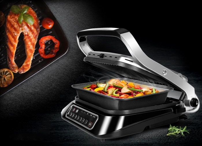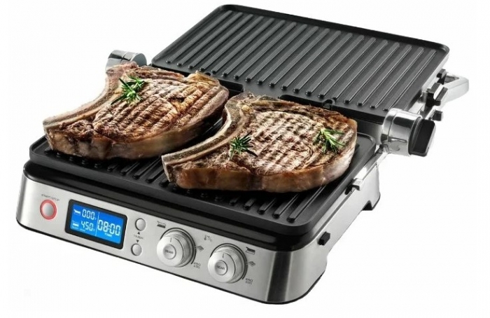 Этот мощный стационарный агрегат возглавляет сегодня рейтинг популярных приборов. С его помощью можно быстро приготовить практически любое блюдо, которое по вкусовым качествам не уступает ресторанным изыскам. Прекрасная обжарка с двух сторон обеспечивается автоматической регулировкой времени. Домашним кулинарам остается только наблюдать за процессом приготовления по дисплею на жидких кристаллах.